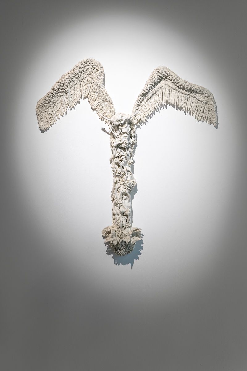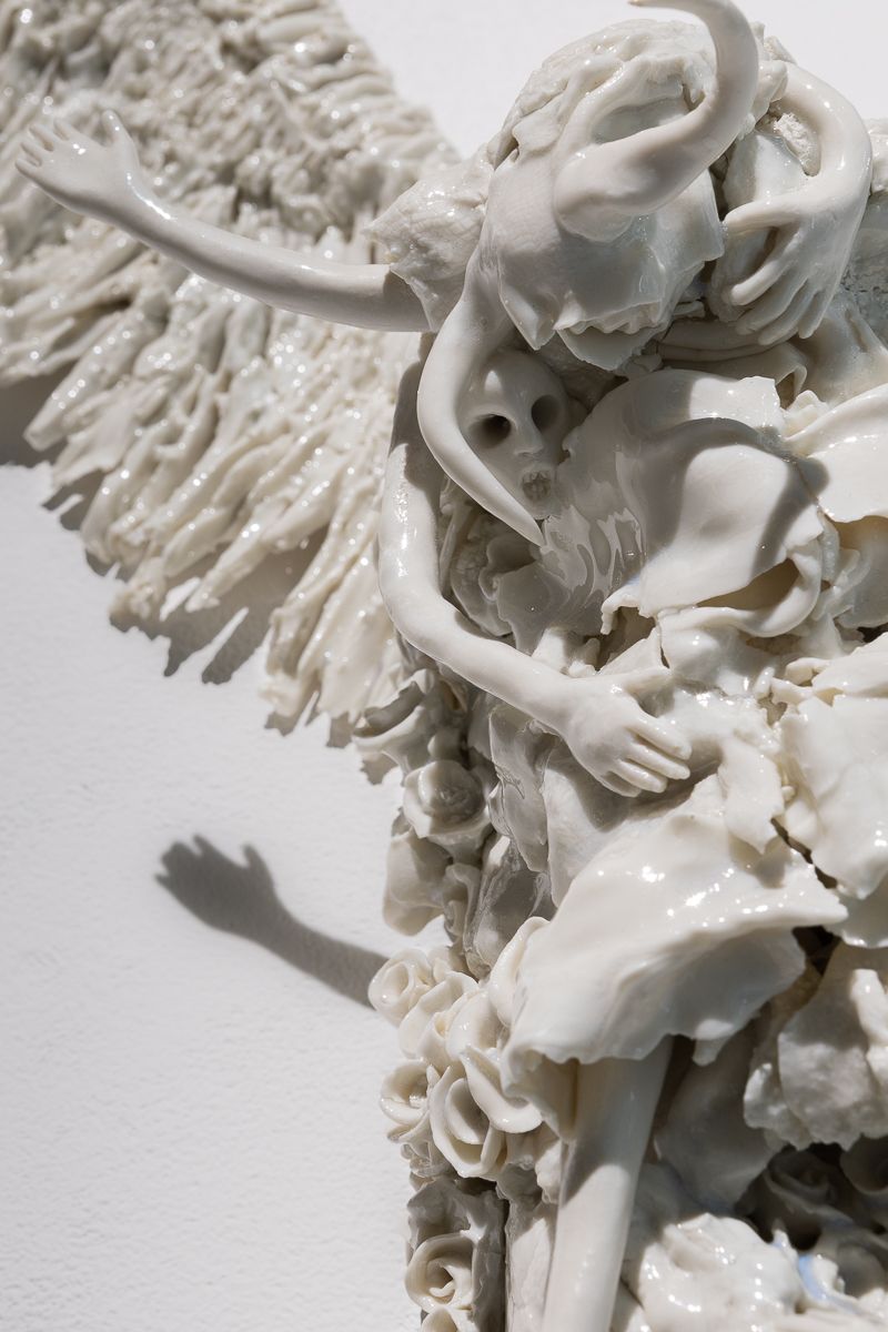 My work has always been nourished by the feminine figure, with obsessive themes – birth, chaos, death, rebirth, impermanence, devotion, cannibalism – subjects that I explored through porcelain sculptures in 2019 during Art Paris at the Grand Palais with Loo & Lou Gallery. Today, going through these long periods of confinement in an anxiety-provoking climate, I feel the need to connect to the luminous, the spiritual, the elevated, the transcendental… to work on repetition, the multiple, the swarming, the infinite, the infinitely monumental in the infinitely tiny, like mantras that soothe and numb cerebral agitation, like broad breaths – to build from chaos, from fragments of aborted or abandoned sculptures, and give them a new breath of life… These long months of gestation birthed immense, immaculate, porcelain Madonnas, adorned with gold, Murano glass, crowned with roses, thorns, roots.”