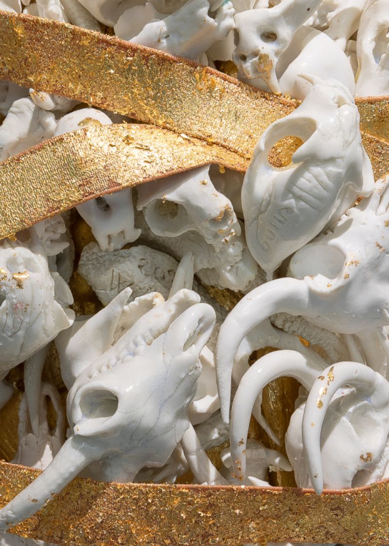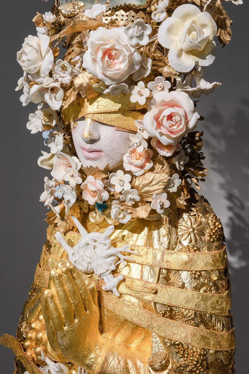 Mon travail se nourrit depuis toujours de la figure féminine, avec pour thème obsessionnel : la naissance, le chaos, la mort, la renaissance – l’impermanence – ou bien encore la dévoration, le cannibalisme, sujet que j’aborde en 2019 à travers mes sculptures de porcelaine pour Art Paris au Grand Palais avec la galerie Loo & Lou. Aujourd’hui, traversant ces longues périodes de confinement, dans un climat extérieur anxiogène, j‘éprouve la nécessité de me connecter au lumineux, au spirituel, à l’élévation, au transcendantal, de travailler sur la répétition, le multiple, le fourmillement, l’infini, l’infiniment monumental dans l’infiniment minuscule, comme des mantras qui apaisent et endorment les agitations cérébrales, comme de larges respirations – de construire à partir du chaos, à partir de fragments de sculptures avortées ou à l’abandon, et leur donner un nouveau souffle de vie… De ces longs mois de gestation sont nées d’immenses madones immaculées de porcelaine, parées d’or, de verre de Murano, couronnées de roses, d’épines, de racines… »