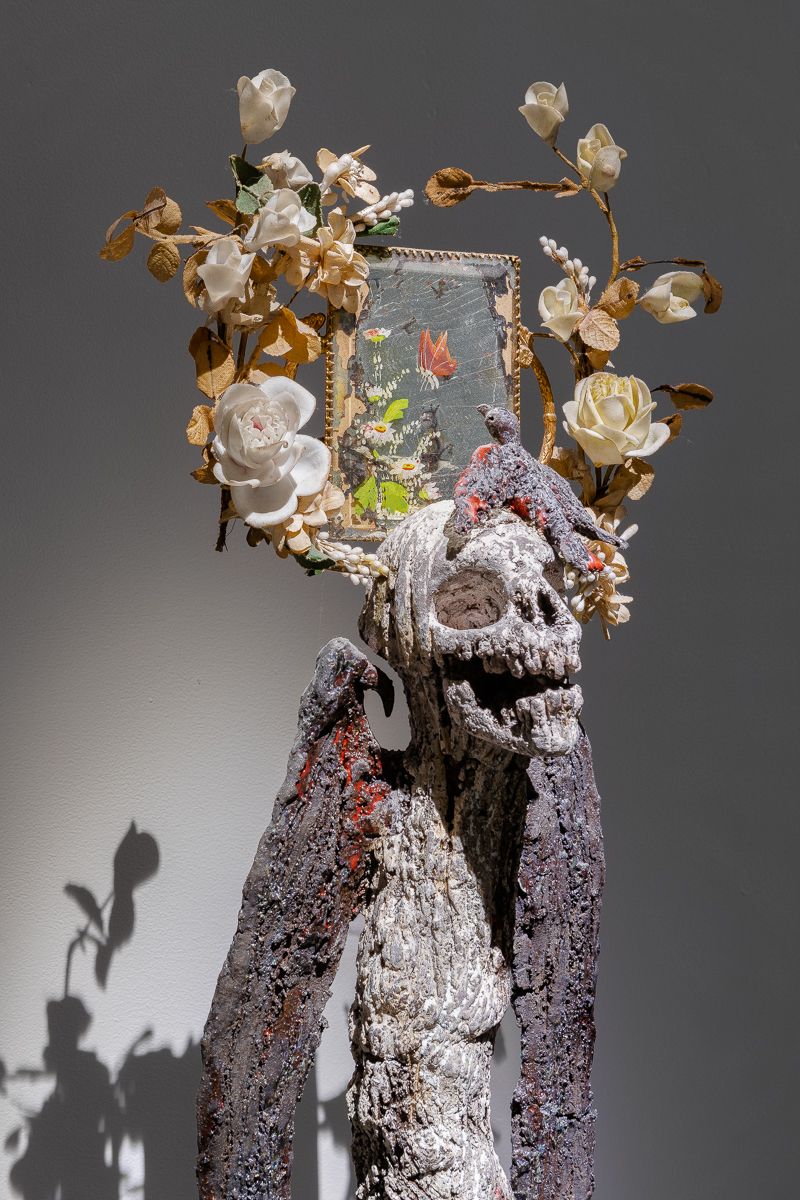Mon travail se nourrit depuis toujours de la figure féminine, avec pour thème obsessionnel : la naissance, le chaos, la mort, la renaissance – l’impermanence – ou bien encore la dévoration, le cannibalisme, sujet que j’aborde en 2019 à travers mes sculptures de porcelaine pour Art Paris au Grand Palais avec la galerie Loo & Lou. Aujourd’hui, traversant ces longues périodes de confinement, dans un climat extérieur anxiogène, j‘éprouve la nécessité de me connecter au lumineux, au spirituel, à l’élévation, au transcendantal, de travailler sur la répétition, le multiple, le fourmillement, l’infini, l’infiniment monumental dans l’infiniment minuscule, comme des mantras qui apaisent et endorment les agitations cérébrales, comme de larges respirations – de construire à partir du chaos, à partir de fragments de sculptures avortées ou à l’abandon, et leur donner un nouveau souffle de vie… De ces longs mois de gestation sont nées d’immenses madones immaculées de porcelaine, parées d’or, de verre de Murano, couronnées de roses, d’épines, de racines… »