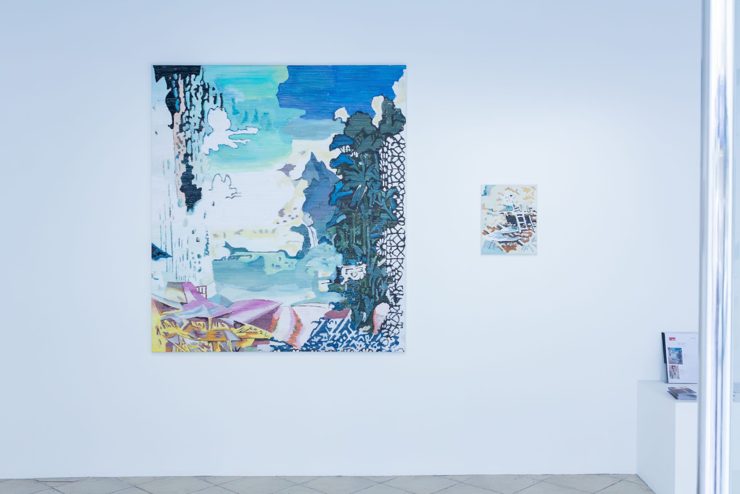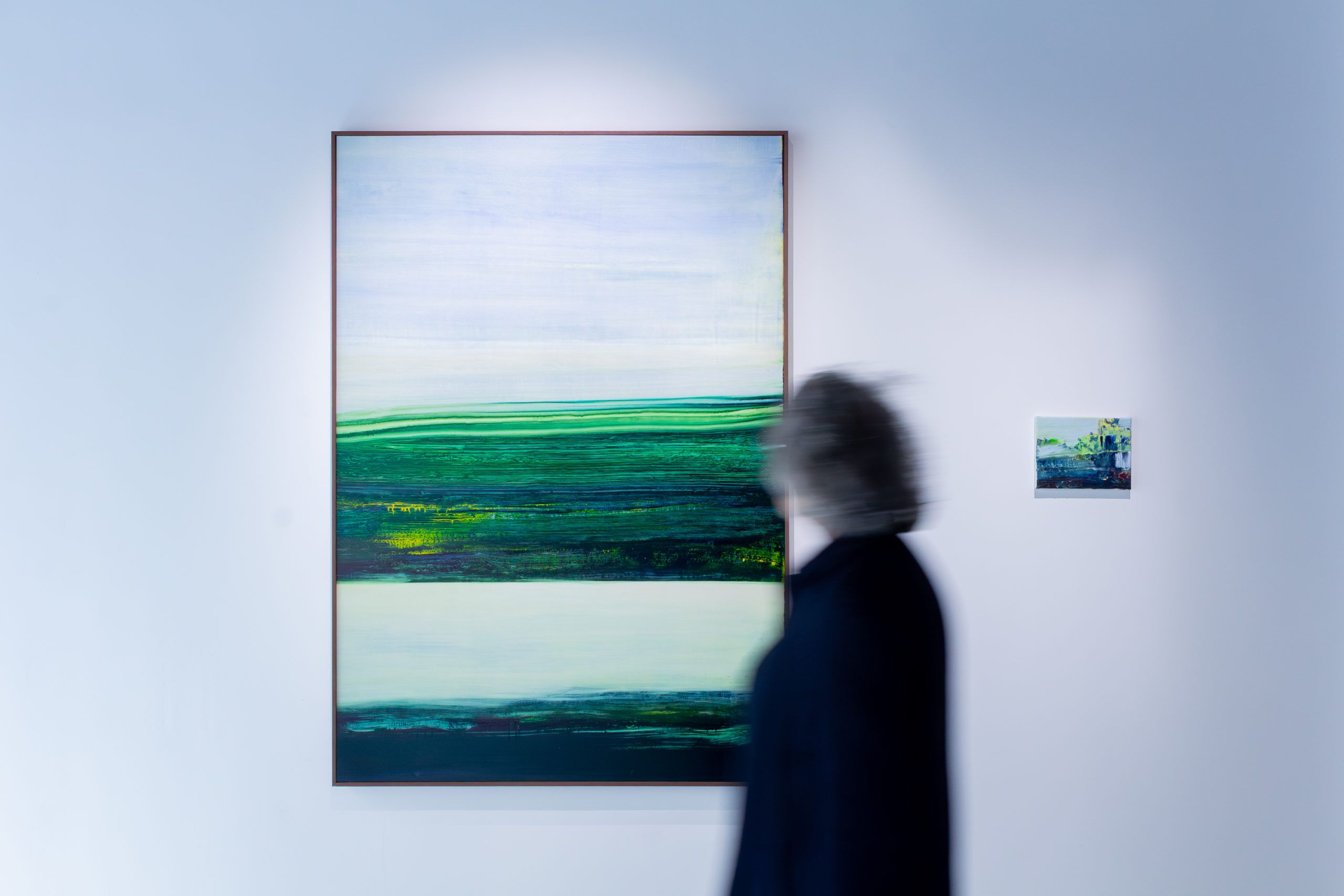 Visionary faces are now replaced by landscapes streaked with nascent greens, diaphanous blues and glowing ochres, expanses where the eye delights in exploring aquatic environments, sometimes surrounded by cliffs and jagged rocks forming a rich phantasmagoria of edges, all bathed in a renewed clarity. Each work seems to be in tune with the elements, permeated by their instability and shifting breath. The eye perceives the humid, beaded air, the diaphanous density of waning clouds, the thrill of restless water suspended in the immensity of the sky. The outline of a circular, stretched-out time emerges, where creation and erosion become one. Van Mullem imbues his landscapes with a tactile memory, made up of moments of physical absorption and connection to the body, affirming the epiphanic significance of intensely sensitive painting. Fullness and contemplation are the key words, without these canvases renouncing the shadow or the promise of renewal, extending towards the horizon this quest for depth that remains intact.