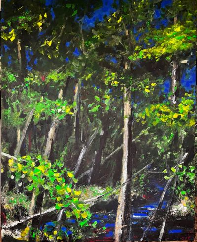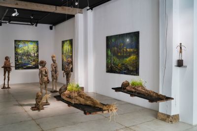 Now, the artist attacks the landscape felt as a body, yet he has removed the human figure. "For me, a painting or a sculpture is always an organism. It is a question of bringing life to it," he expresses. Facing the canvas, the artist creates more than he paints. His hands knead the clay and, this time, he has mixed it with grass, glue, and acrylic. Composite material that will never solidify, but could be sown. His body moves in front of crusty materials whose germinations stretch out in dazzling undergrowth. With large gestures from top to bottom, without any prior idea, he enhances it with bright colors, making the plants grow towards the light in a spontaneous, irrepressible impulse of elevation and depth. The texture becomes denser, materialist, welcoming reliefs and transcending any idea of representation. The painting here is not an image: it is breathing and has become "flesh." Their naturalistic textures enhanced with expressionist colors inevitably brings to mind Anselm Kiefer's dramatic fields of straw, mud, coal, and lead. Bright yellow, dreamy blue, acid green, a mysterious red… With De Sagazan, however, the landscape is anything but symbolic, it is the energy of nature whose magical body extends our own. The artist also sees self portraits in them, like a transfiguration of his conscious being within earth. He claims deep commitment in imagining a new alliance between man and nature: a nature that he has wrongly forgotten, to the point of disincarnating from it. Painting and sculpture would perhaps be the only gestures capable of making us feel this physical, biological link that unites our flesh to the world in an unfathomable sensitivity.