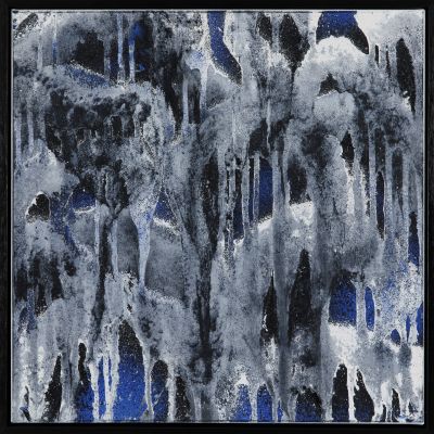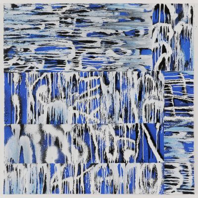Lines, drips, stains form segmented writings, intertwined in networks. From their optical synthesis, figurative images sometimes emerge: a blue tree blown down by the wind, branches bending under the weight of snow, unspeakable things reflected in the water, or, again, water trickling over the signs of an unknown writing. It is a matter of flow and blue. The use of two types of spray cans, one based on solvents, the other based on water, contributes to create accidents of textures favourable to the reverie of the eye.