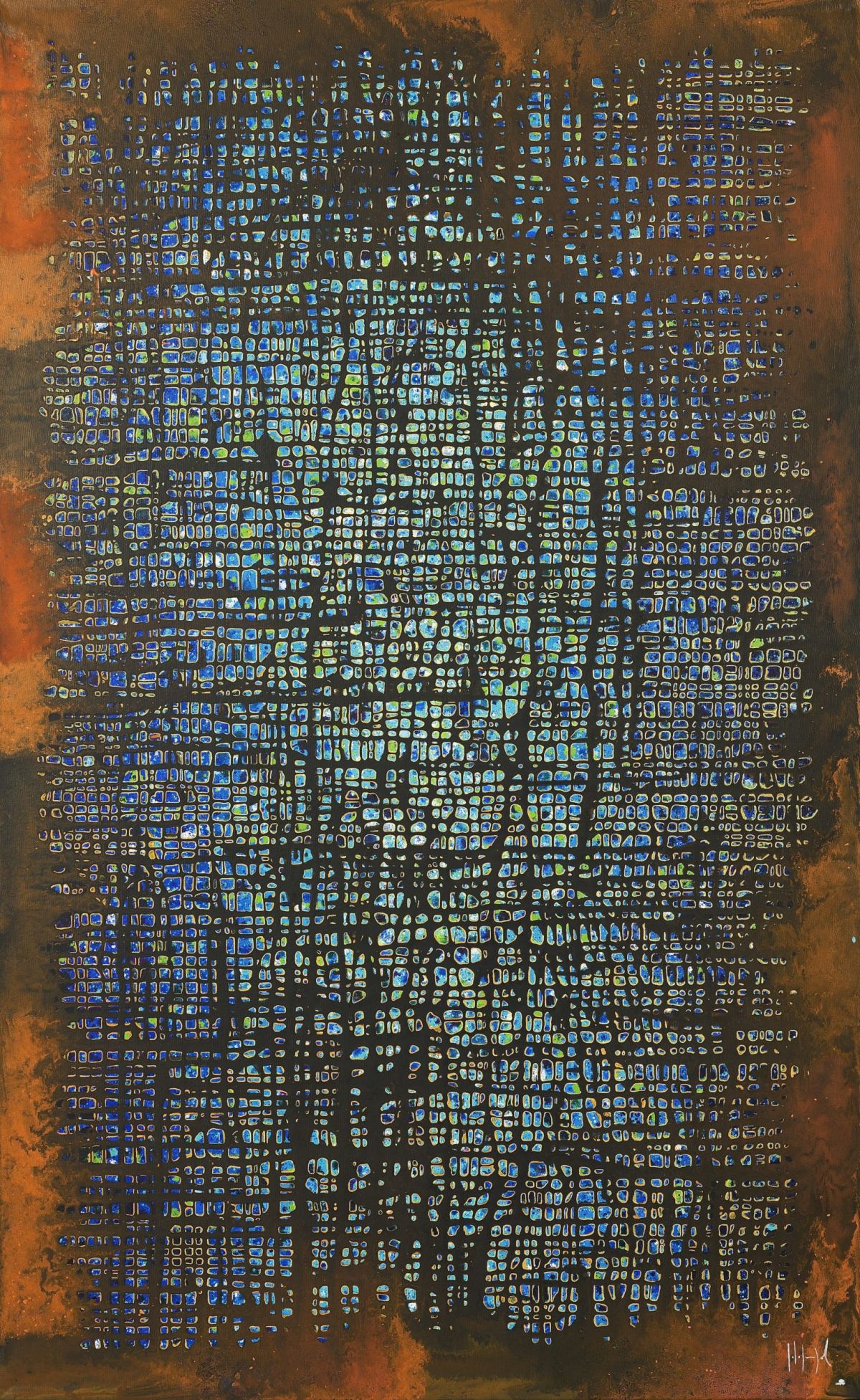 L’œil monte, s’agrippe. Tout comme le liquide vital, sève ou sang, s’élève, flux tranquille ou jet impétueux, d’une cellule à l’autre au sein d’un être vivant. Mais est-ce bien de cellule qu’il faut parler pour désigner les ajours (parfois sertis d’un bleu de gemme qui n’est pas sans évoquer Evi Keller), les distensions ou les lacunes qui criblent la surface entrecroisée des trames de Pierre-Luc Poujol ? On pourrait aussi bien penser à des alcôves, voire au quadrillage d’un vitrail : un vitrail dont la lumière, ses clartés de glace ou ses ors en fusion, aurait fait fondre les scènes figurées au-delà du visible, au-delà de tel ou tel sujet de l’histoire sainte. Mais qu’importe les dénominations : ces œuvres de la série Between the Lines épousent, comme en un mariage à la fois très charnel et très mystique, les arbres, elles naissent de l’empreinte de leur écorce, et l’œil lui aussi les épouse. Il les suit vers les hauteurs, comme les bras de l’enfant qui ceint le tronc d’un arbre, puis s’élance de branche en branche et grimpe vers le feuillage. Tandis, peut-être, que le soleil, tamisé par les frondaisons, dessine sur le sol des bois un complexe damier de lumières et d’ombres.