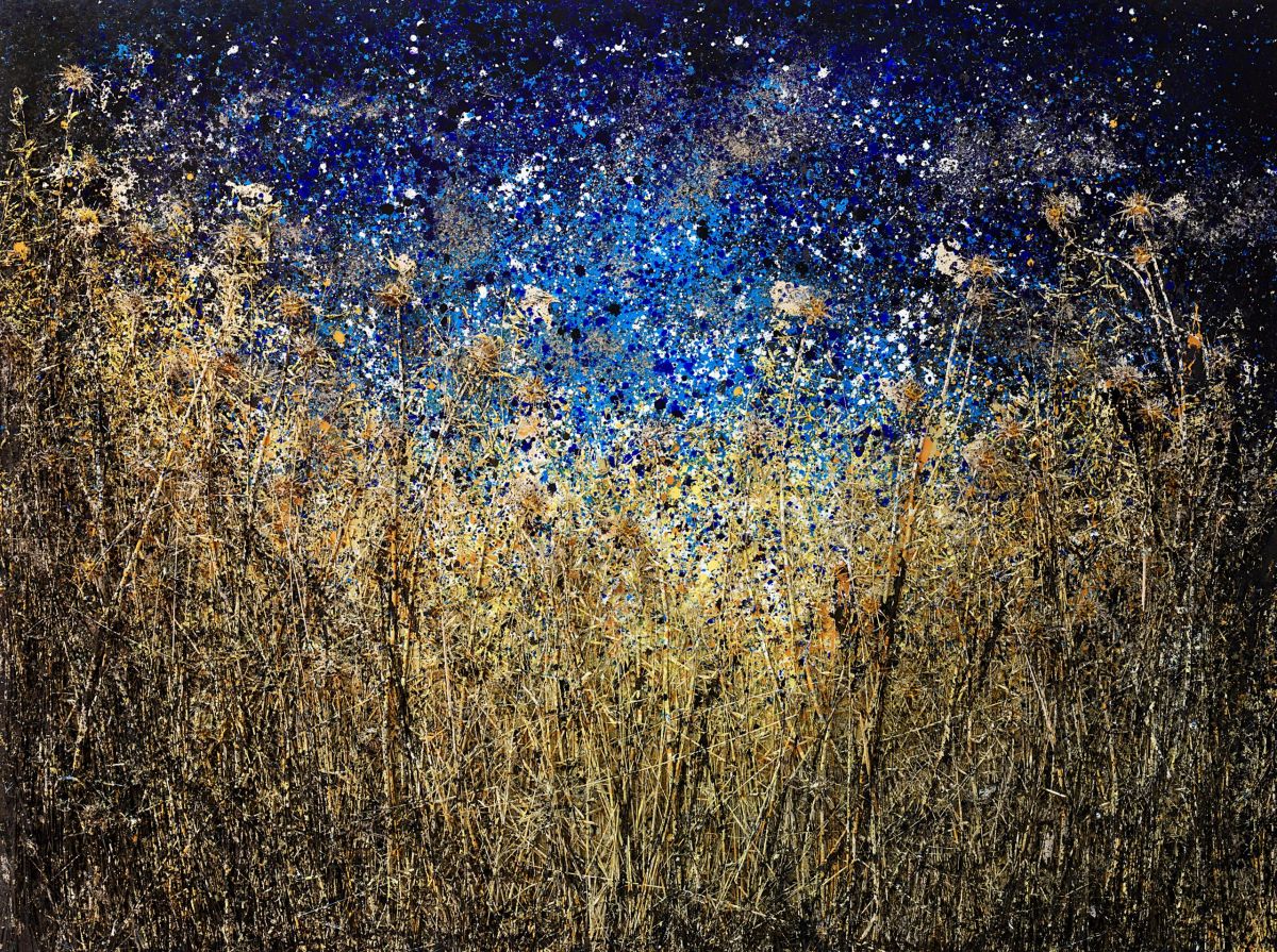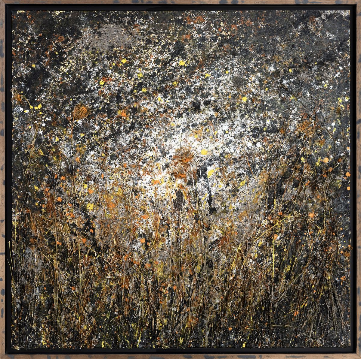 Un temps certes très physique, un temps qui a la consistance friable, les aspérités et les reliefs de la matière. Car c’est ainsi, par la matière, que les œuvres de Pierre-Luc Poujol s’« ancrent » dans le monde : elles puisent littéralement dans le paysage, dans ce qui le constitue très substantiellement. Regardez la série Lisières, ces surfaces argentées, grattez-les, ce qui en tombera, ce sera la cendre d’arbres calcinés. Et ces cendres, les voilà qui, ici et là dans ces Lisières, s’épanouissent dans des ciels dont on se dit que les a aussi vus Van Gogh, et bien avant eux, bien avant Pierre-Luc Poujol ou Vincent Van Gogh, le roi David : ce dernier ne chantait-il pas, Psaume XVIII, 1, que « les cieux racontent la gloire de Dieu, et le firmament publie les ouvrages de ses mains » ? Les cendres se transmuent ainsi en autre chose. A partir des traces de la destruction, à partir de l’empreinte (cette empreinte comme une blessure au nom si laid d’anthropocène) de l’homme sur les forêts, le monde est recommencé.