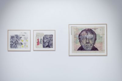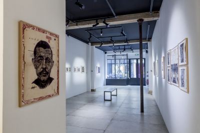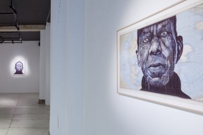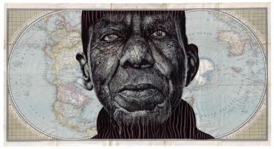 Sur des papiers anciens à l’apparence surannée – enveloppes timbrées, cartes routières, cartes à jouer – Mark Powell (1980, Angleterre) dessine exclusivement au stylo bille toute une galerie de portraits dont la puissance expressive interpelle l’œil avec force et autorité. Ici, l’artiste prend soin de figurer l’ensemble des contours épidermiques de ses sujets - visages inconnus le plus souvent croisés dans la rue - semblant alors comme insister sur toute leur texture corporelle véritablement parcheminée : rides et pates d’oies creusent des sillons à même la peau, imprimant les traces de la mémoire et les marques du temps, celles-là même qui pénètrent le paysage et les sols géologiques. L’inscription géographique s’incarne et se loge dans les détails anatomiques : fondu dans le plan et non plus distinct de l’environnement, le visage devient palimpseste, Mark Powell générant dans ses œuvres une nouvelle mécanique du regard. La peau se fait pleinement surface : elle n’est convoquée que pour signifier l’intériorité, l’artiste s’attachant à en révéler la part énigmatique, soit toute la densité. Cette dernière semble comme mue par les pérégrinations passées – trajectoires personnelles, cheminements culturels – où l’intime et l’histoire se mêlent sans jamais se déranger. Et tenu éloigné des images de la perfection, le visage s’offre alors comme un livre ouvert où la lente voussure du derme et des carnations instruisent les profondeurs de la mémoire, tout comme sa sédimentation.