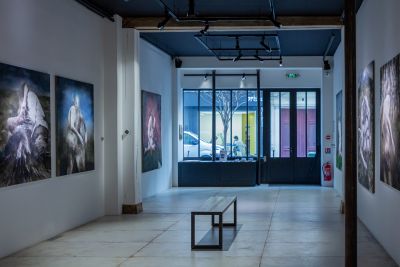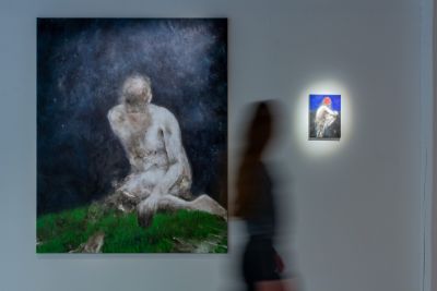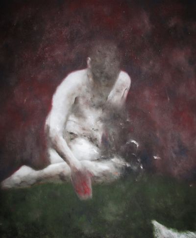 Jetons un coup d’œil aux œuvres sur papier : pétrissage des silhouettes, malaxage irrégulier des contours (Schiele n’est sans doute pas loin), giclures, éclaboussures, épanchements. Ça souffre : chair dolente. Revenons à la peinture : lividités de Crucifié, vaisseau du corps en voie de dissolution. Masses de chair gris-blanc, demi-solides, dont on dirait volontiers ce qu’écrit, avec son effroyable lucidité, Fritz Zorn de son cancer : « C’était comme si toutes les larmes que je n’avais pas pu – et n’avais pas voulu – verser dans ma vie s’était rassemblées dans mon cou pour former cette tumeur ». Mais il y a ces couples aussi. Jouissance, supplice, qu’importe, et pas seulement parce que l’un, comme on nous l’a assez rabâché, est le revers de l’autre – mais parce que cette peinture est purement corporelle, purement sensation. Et que l’emplacement du curseur (agonie ou orgasme) importe tout compte fait moins que les altérations sensibles du sujet affecté. La façon dont sa chair se dissout, se fond, ou irradie et persiste.