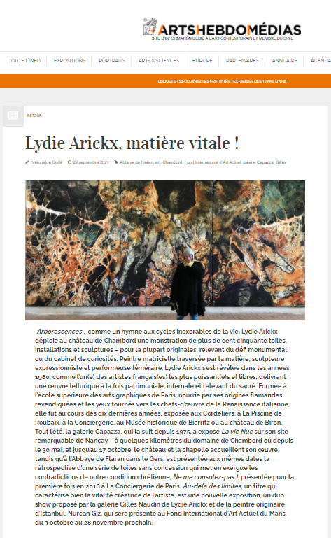 Lydie Arickx, "LYDIE ARICKX VITAL MATTER, ART HEBDO MEDIA, SEPTEMBER 2021