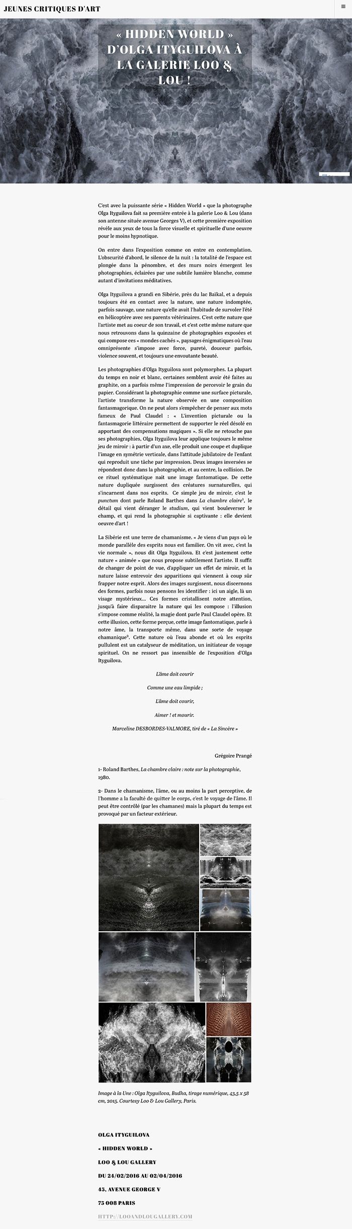 OLGA ITYGUILOVA, « Hidden world », Jeunes Critiques d’Art, February 2016