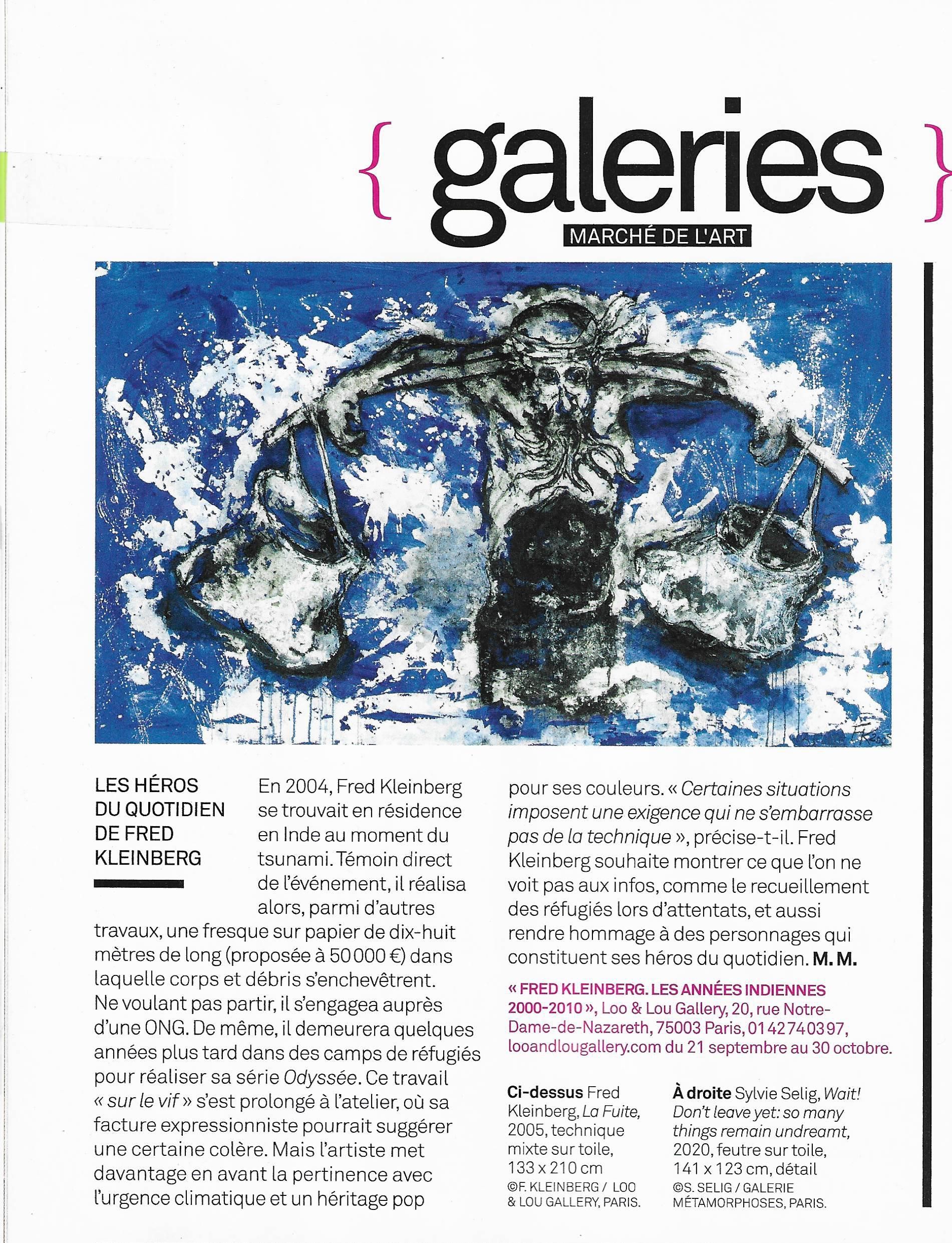 In the "Galleries - Art Market" section of the October 2021 magazine of Connaissance des arts magazine, an article by Marie Maertens on the exhibition Les Années Indiennes by Fred Kleinberg