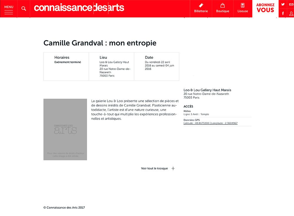 CAMILLE GRANDVAL, « Mon entropie », Connaissance des Arts, Avril 2016